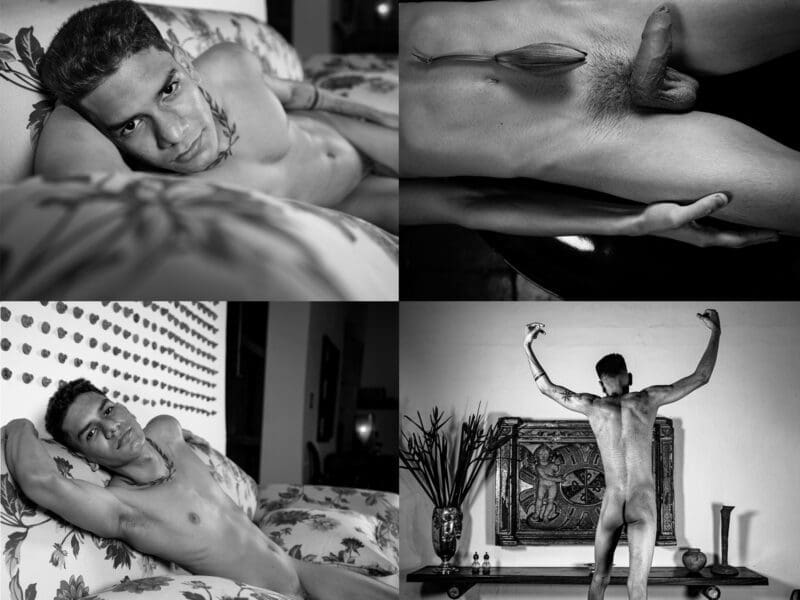 We were in the living room of my quarters at Suesca, in the old Hacienda where we were staying for the photo shoots. The room had an air of historical grandeur, its aged walls lined with artworks that hinted at its storied past. Andrés, somewhat shy and naturally reserved, requested to be photographed alone. Acknowledging his comfort, I asked the other models to give us some space, and they promptly left the room, leaving a quiet intimacy behind.